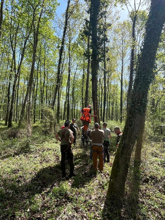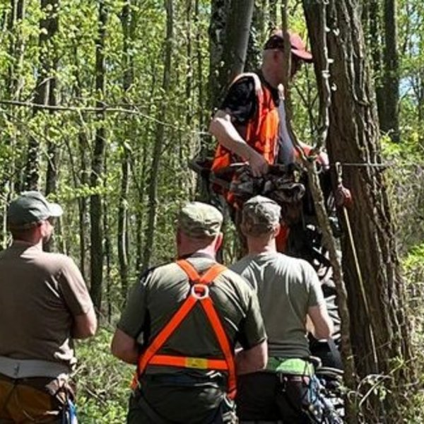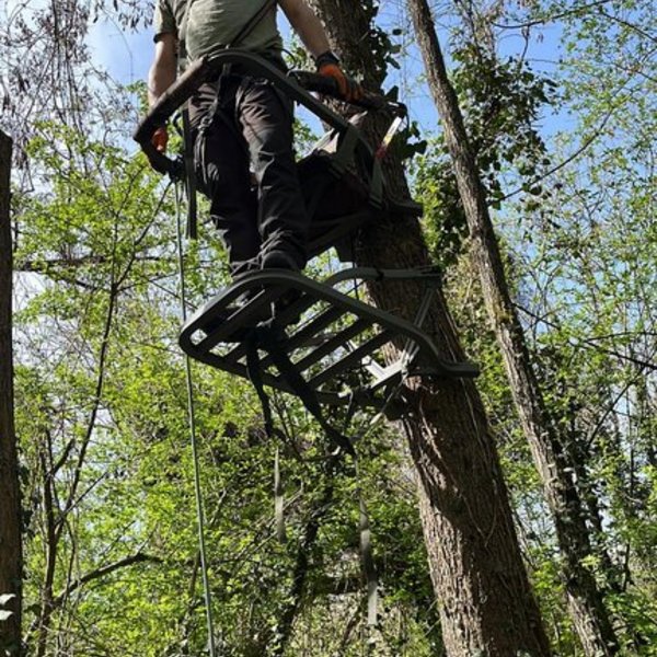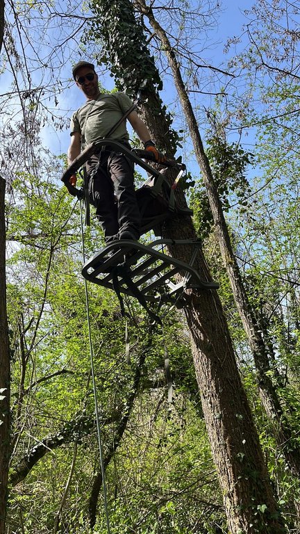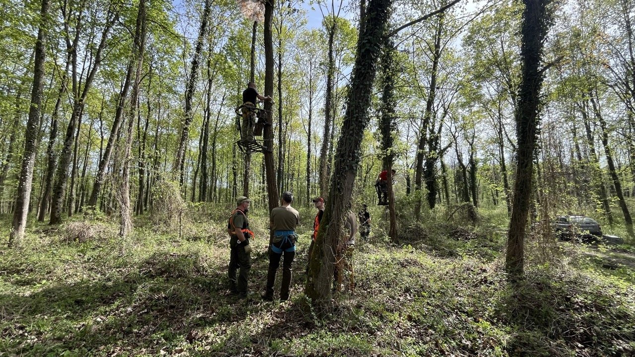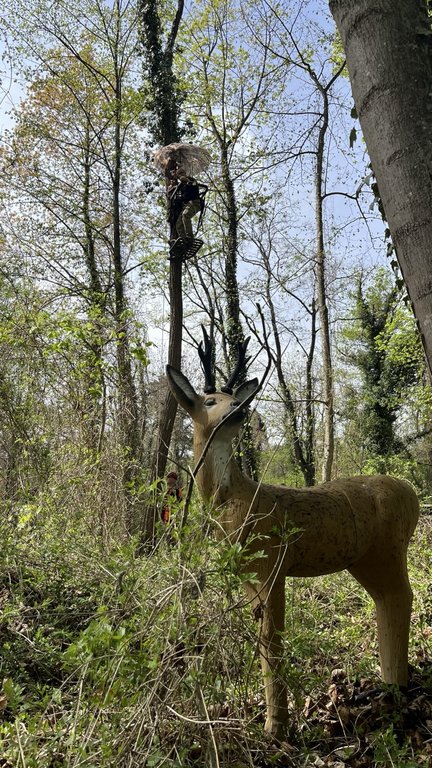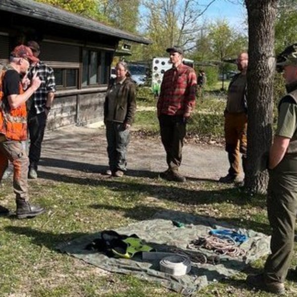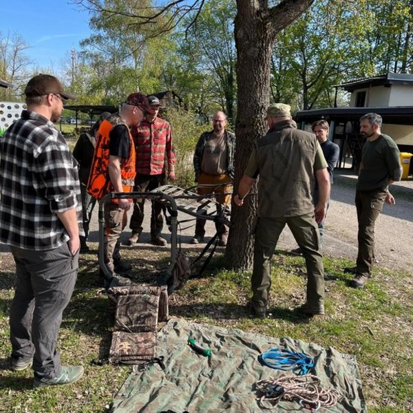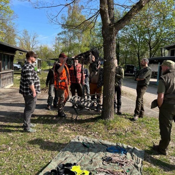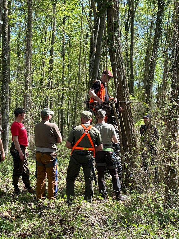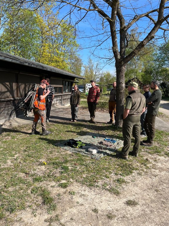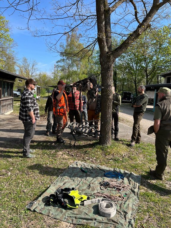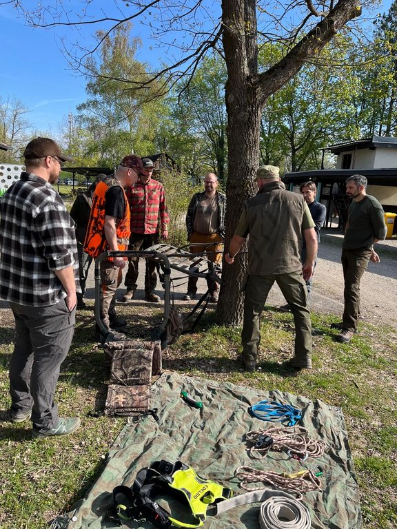 Unter dem Leitsatz „Safety First“ übten die Teilnehmer die Eigensicherung. Um den Kurs erfolgreich abzuschließen, mussten mehrere Prüfungen bestanden werden. Dazu gehörten das kontrollierte Abseilen zur Eigenrettung aus sechs Metern Höhe sowie das Erklimmen eines Baumes mit dem Klettersitz bis zum Anschlagen einer Glocke. Zudem wurde das Einrichten des Sitzes für einen optimalen Schusswinkel und die Problemlösung bei technischem Versagen – etwa wenn die Fußplattform abrutscht – intensiv trainiert.