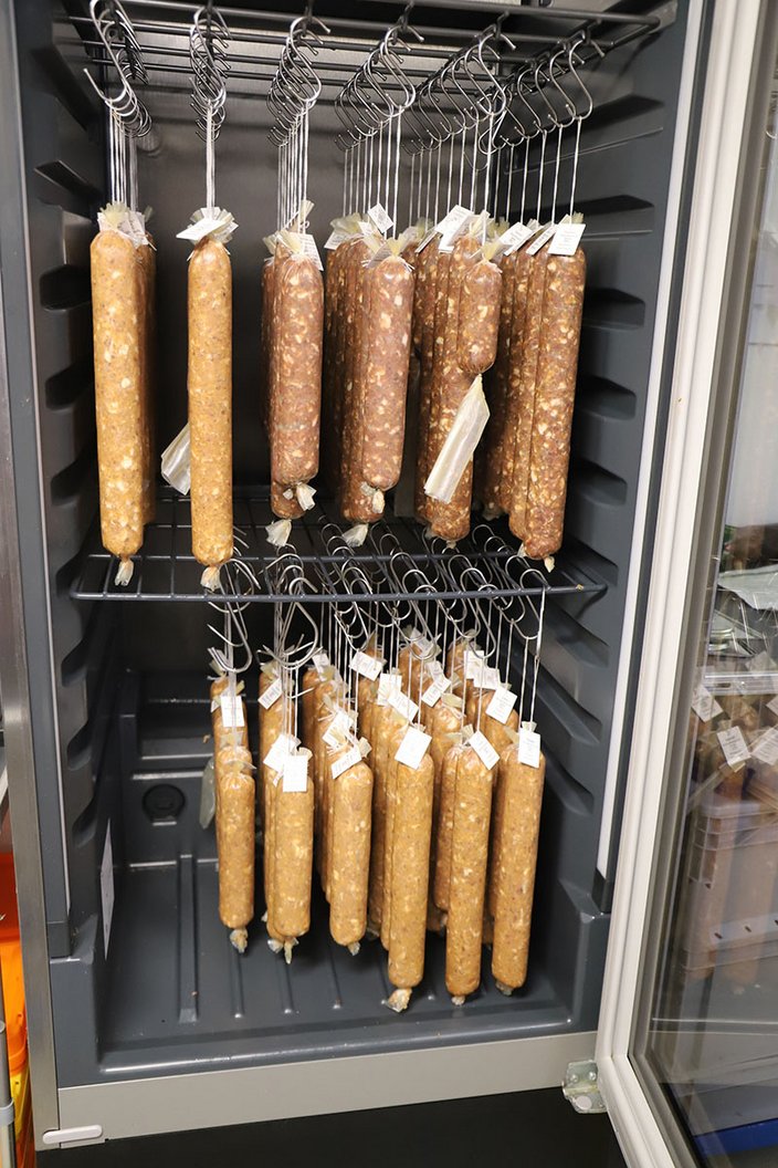 Nach Vorbereitungen wie dem Zerkleinern und wolfen des Wildbrets, Gewürze abwiegen und unter das Fleisch mischen, wurde das Wurstbrät gekuttert und in die Därme gefüllt. Anschließend wurde alles sauber beschriftet und in Reih und Glied in den Reifekühlschrank gehängt.