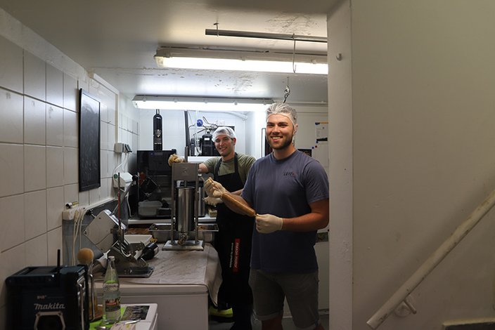 Der Einladung folgten drei interessierte Jungjäger. Am Vormittag ging es los mit Hirschsalami in den Variationen Paprika-Fenchel sowie Bourbon-Walnusssalami. Weiter ging es am Mittag mit Salami vom Wildschein. Der Schwarzkittel kam regional vom sonnigen Kaiserstuhl und wurde einmal mit Aquavit + Kümmel sowie einmal in einer scharfen ungarisch-Paprika-Chili Variante zu Wurst verarbeitet.